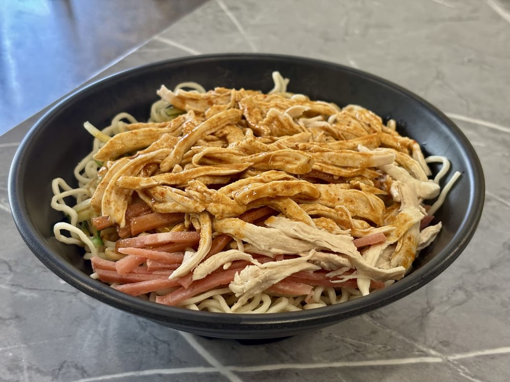 尚禾家的涼麵,是那種我們記憶中最熟悉的經典台式風味。黃金組合不外乎是清爽的小黃瓜絲、鹹香的火腿與靈魂所在的雞絲,再淋上店家特調的濃郁麻醬。如果你跟我一樣,對份量總有些不安全感,可以選擇加麵或加料,店家會為你客製一碗紮紮實實的滿足。