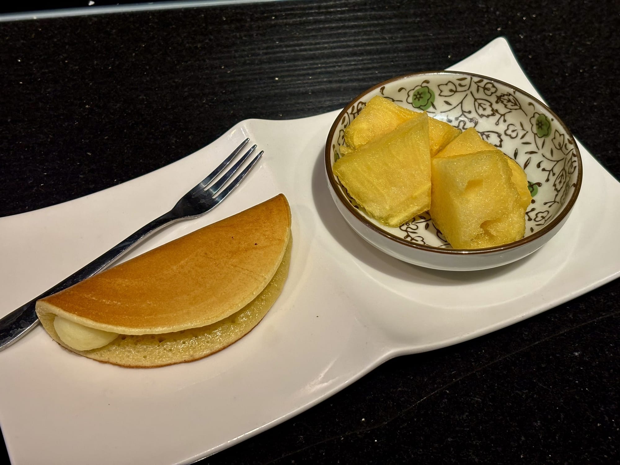 一頓飯是否用心,也同時體現在配角上。這裡的蘿蔔湯,清甜暖胃,喝不夠還可以再續,暖心又暖身。飯後的甜點是現煎的銅鑼燒,溫熱的餅皮包著不過於甜膩的紅豆餡,作為結尾恰到好處。最讓我感動的是水果,連西瓜都細心地去籽、切成小塊,這種不經意的體貼,最能打動人心。