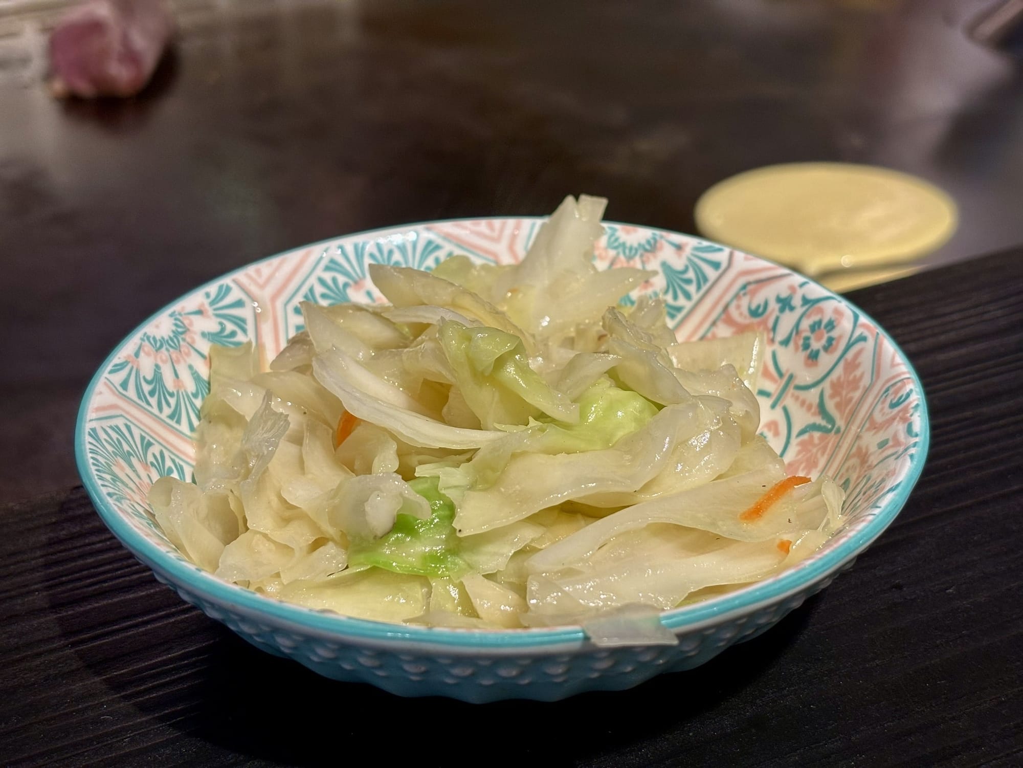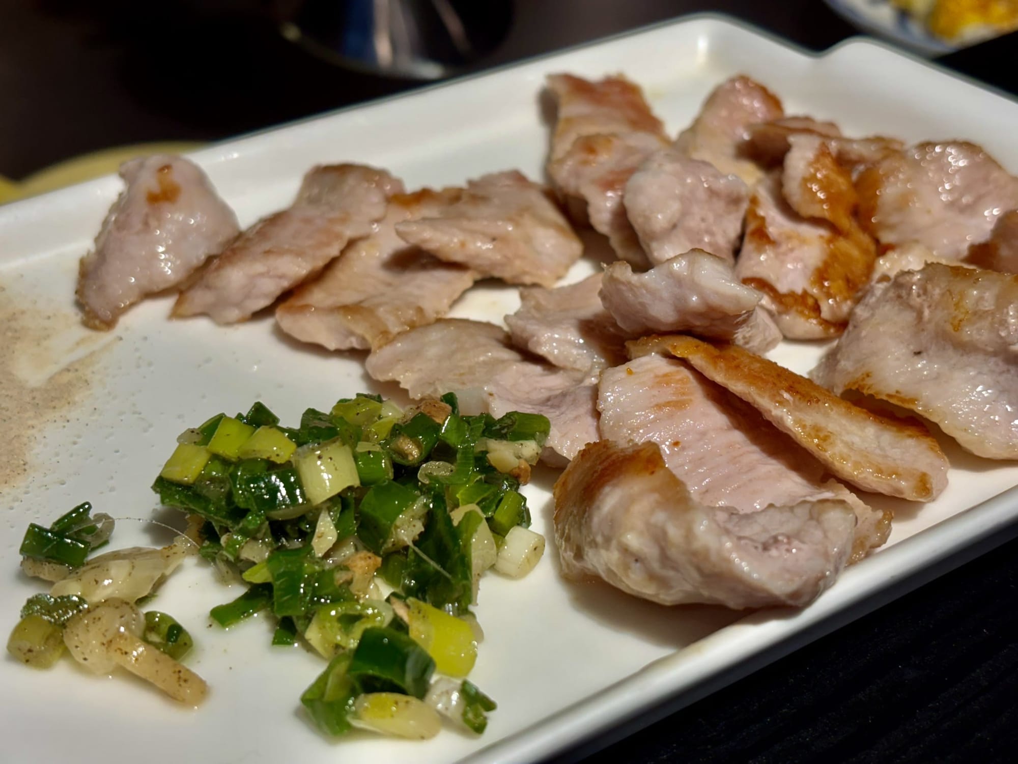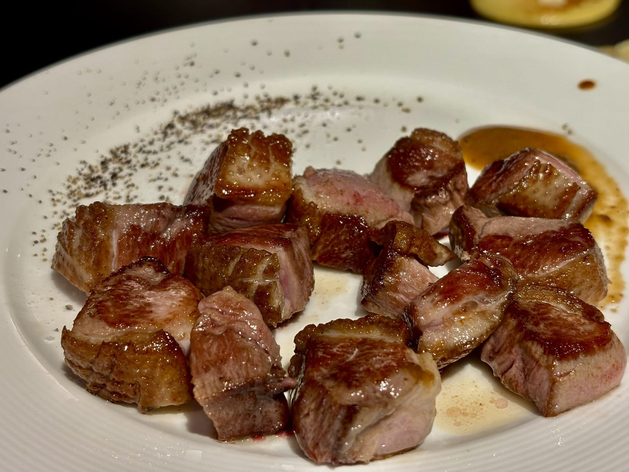 這道櫻桃鴨胸,絕對是當晚最大的驚喜。師傅將鴨胸處理得像一塊上好的牛排,鴨皮在鐵板上被煎得琥珀油亮、酥脆无比,而內裡的鴨肉卻維持著約七分熟的粉嫩色澤。切成適口的小塊,單純搭配胡椒鹽就已足夠美味,沾上一點醬料更是提升了層次。那種皮酥肉嫩、彈牙多汁的口感,是一道展現了精湛手藝的主餐。