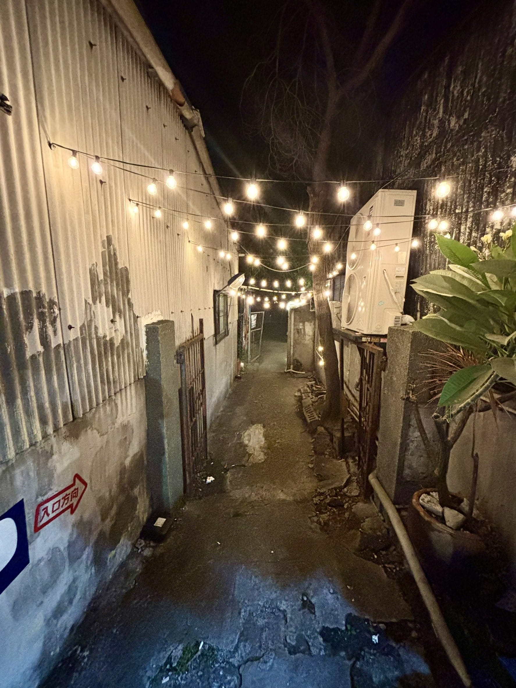 點完餐點後,你得先穿過一條不起眼的小巷子。這種「尋寶」般的過程,反而讓人對接下來的空間多了幾分期待。穿過巷弄,眼前豁然開朗,用餐區就在這片露天庭院裡。