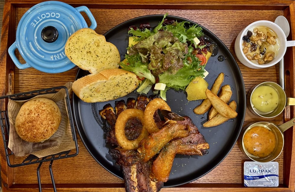 一個好的早午餐盤,配角往往才是靈魂。 我很喜歡他們對待副餐的用心:生菜沙拉淋上了清爽的柚皮醬汁,搭配葡萄乾、番茄與地瓜,清脆解膩,剛好平衡了主餐的油脂感。洋蔥圈與炸薯塊炸得乾爽酥香,讓人忍不住一口接一口;大蒜麵包濃郁酥脆,而店家自製的優格撒滿了堅果,為整頓餐點畫下一個健康的句點。