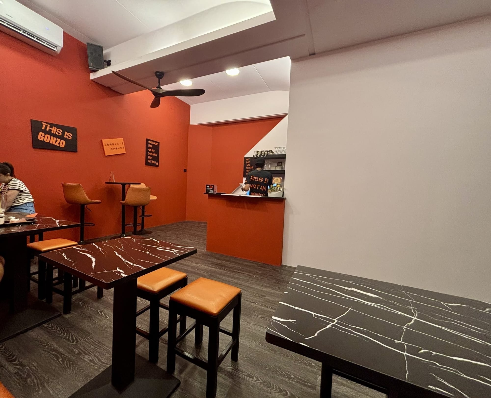 推開門,店內的空間不大,座位數也不多,但這種緊湊感反而拉近了人與食物的距離。裝潢走的是一種帶點工業風的隨性路線,沒有精緻的網美牆,卻有著讓人放鬆的真實感。牆上掛著的自製標語以及橘紅與白色牆面的色彩碰撞,透露著店主對於料理有著堅持。