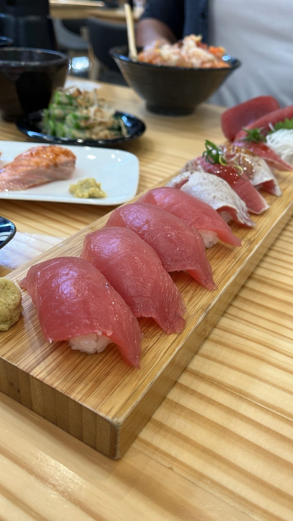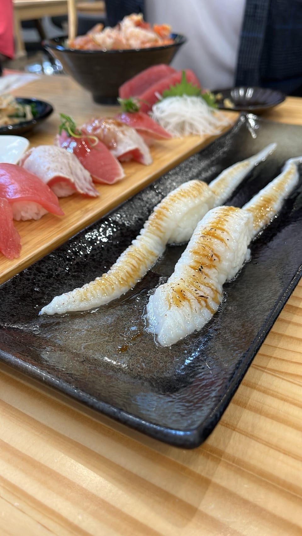 從赤身到不同部位的鮪魚,呈現出漸層般的紅色光澤。赤身的口感軟嫩適中,帶著鮪魚獨有的微酸鐵質香氣;而油脂較豐富的部位則細膩滑順,入口後的餘韻悠長。對於鮪魚愛好者來說,這是一場樸實卻精彩的味覺展演,沒有過多的調味修飾,直球對決。