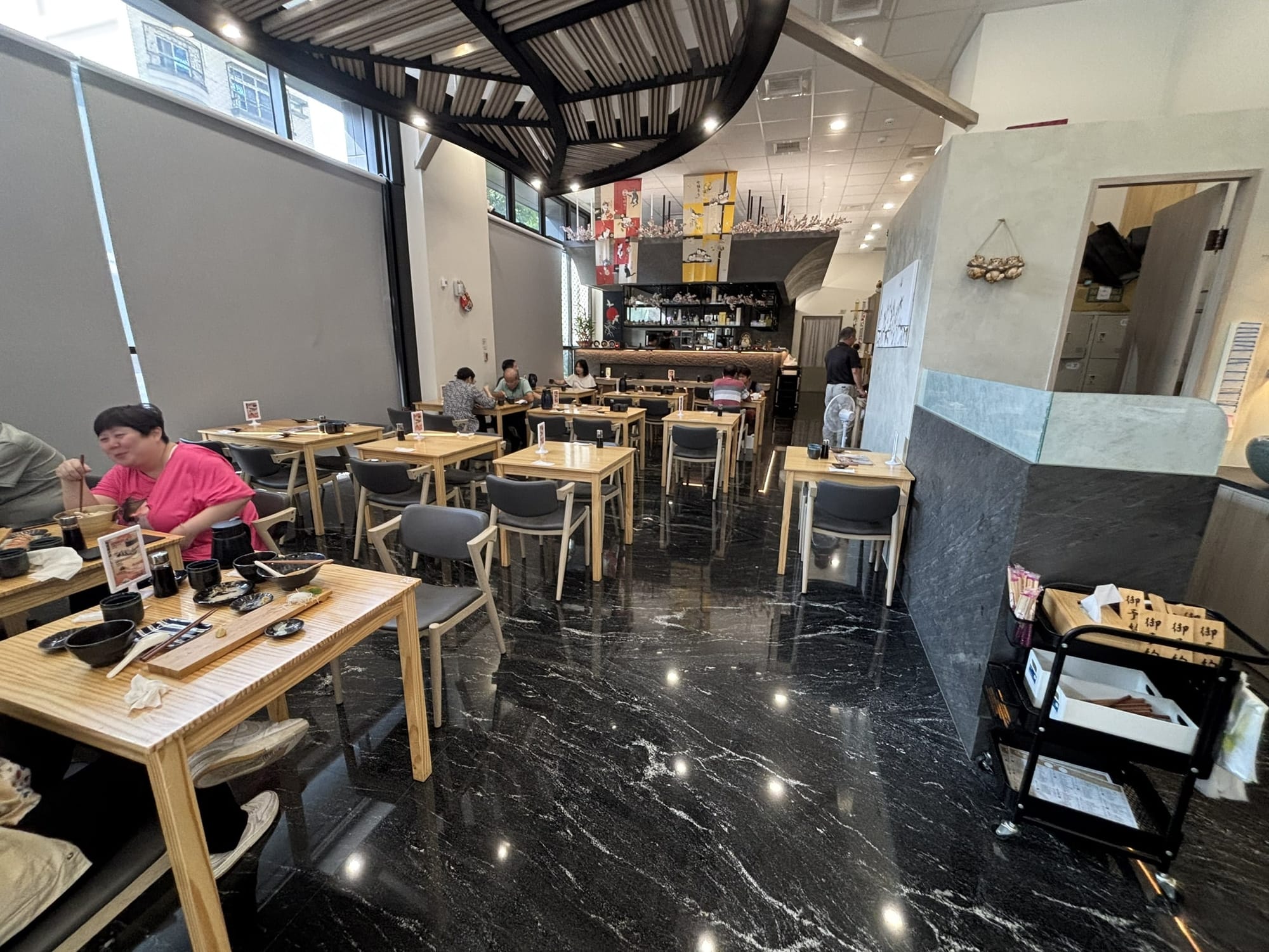 店內的空間不小,與鄰桌也有足夠的間隔,不會讓人覺得擁擠。暖黃色的燈光灑在木質調的裝潢上,營造出一種溫潤的氛圍。空氣中沒有惱人的油煙味,只有淡淡的醋飯香氣若隱若現。