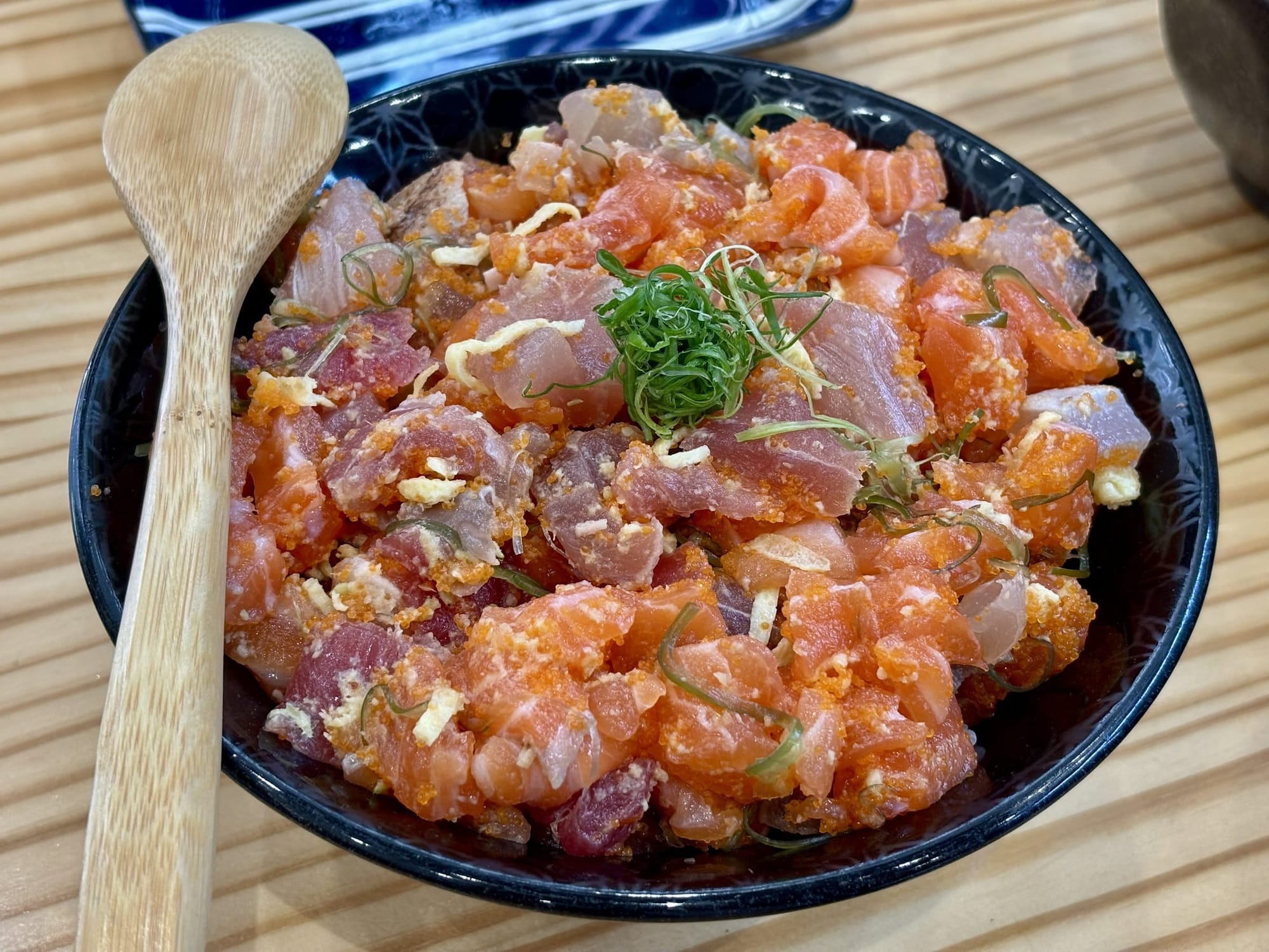 這碗丼飯端上桌時,與其說它是傳統的生魚片蓋飯,不如說是一幅色彩斑斕的「散壽司」畫作。鮭魚、鮪魚與旗魚被貼心地切成略似小型骰子牛般的方丁狀,不僅好入口,視覺上也顯得小巧可愛。