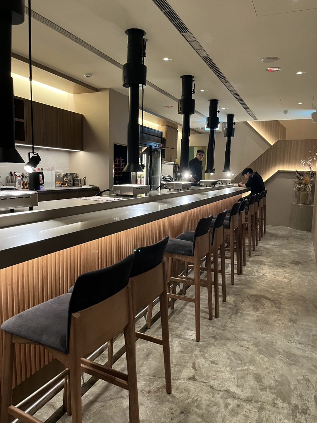 推開門,外界的喧囂瞬間被隔絕。一樓的吧台區,讓我想起日本那些可以獨自品嚐美食的深夜食堂,就算一個人前來,也能自在地與眼前的食物對話,享受一場不被打擾的饗宴。二樓則是適合三兩好友的方桌區,座位間的留白恰到好處,沒有壓迫感,讓人能真正放鬆下來,專注於接下來的每一口滋味。