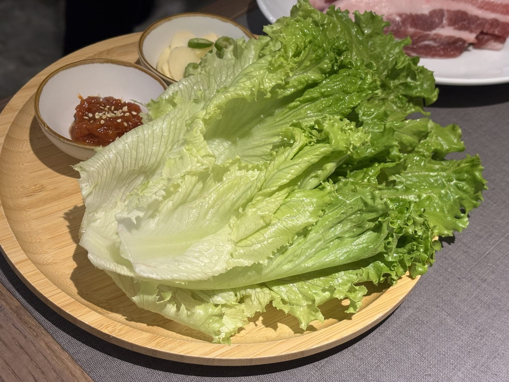 在和牛的華麗樂章之間,這道豬五花就像一段清爽的間奏。烤得金黃酥香的五花肉,肥瘦恰到好處,用新鮮生菜包裹,再配上特製醬料一同入口,蔬菜的清甜巧妙地中和了油脂,創造出一種韓式吃法獨有的平衡感。