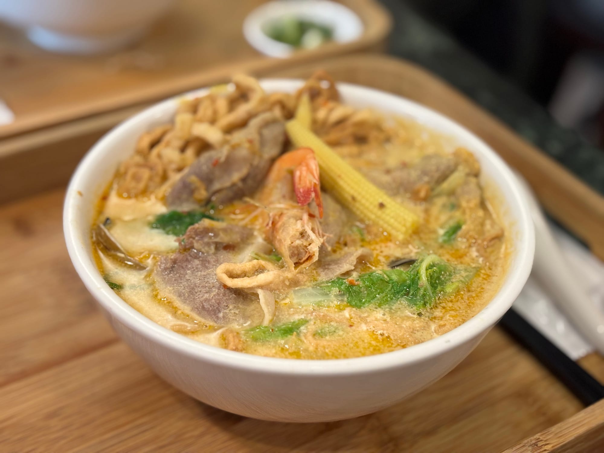 手炒叻沙鍋燒:這湯頭濃郁得很有層次,辛香料的味道被火氣炒出了深度,既開胃又不顯膩。每一口湯都能感受到那種手工炒製的香氣,與料多實在的配菜結合,讓原本平民的鍋燒麵瞬間提升到了異國料理的高度。
